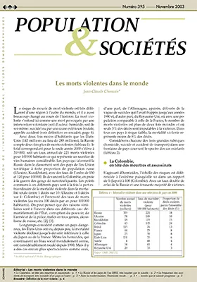 Avec deux fois moins d'habitants que les États-Unis (143 millions au lieu de 285 millions), la Russie compte deux fois plus de morts violentes (tableau 1) : le total correspondant pour la seule année 2000 s'élève à 319 000, soit un taux annuel de 221 morts violentes pour 100 000 habitants ce qui représente un sacrifice de vies humaines considérable. Les pays qui talonnent la Russie dans le classement sont des pays de l'ex-Union soviétique à forte proportion de population russe (Ukraine, Kazakhstan), avec des taux de l'ordre de 150 et 120 pour 100 000. Ils devancent la Colombie, en proie à la guerre des gangs de narcotrafiquants. Les points communs à ces différents pays sont à la fois la part extraordinaire de la mortalité violente dans la mortalité totale (entre 1 décès sur 10 : Ukraine et 1 décès sur 4 : Colombie) et l'intensité des taux de morts violentes (au moins 100 décès par an pour 100 000 habitants). On peut penser que des raisons similaires sont à l'oeuvre dans ces différents cas : démantèlement de l'État, corruption du pouvoir, de l'armée et de la police, trafics en tous genres, alcoolisme de masse, etc.[2],[3].